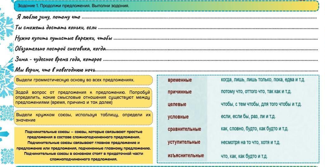 ПОМОГИТЕ ПОЖАЛУЙСТА СРОЧНО ПОМОГИТЕ Задание 1. Продолжи предложения. Выполни задания. Я люблю zumy, потому что Ты сможешь досмать коньки, если Нужно купить пушистые варежки, чтобы Обязательно построй снеговика, когда... Зима-чудесное время года, которое Мы верим, что в новогоднюю ночь.... Выдели грамматическую основу во всех предложениях. Задай вопрос от предложения к предложению. Попробуй определить, какие смысловые отношения существуют между предложениями (время, причина и так далее) Выдели кружком союзы, используя таблицу, определи их значение Подчинительные союзы - союзы, которые связывают простые предложения в составе сложноподчиненного предложения. Подчинительные союзы связывают главное предложение и предложение или предложения, подчиненные главному предложению. Подчинительные союзы в основном стоят в придаточной части сложноподчиненного предложения. ------- временные причинные целевые условные сравнительные уступительные изъяснительные когда, лишь, лишь только, пока, едва и т.д. потому что, оттого что, так как и т.д. чтобы, с тем чтобы, для того чтобы и т.д. если, если бы, раз, ли и т.д. как, словно, будто, как будто и т.д. несмотря на то что, хотя и т.д. что, как, как будто и т.д.