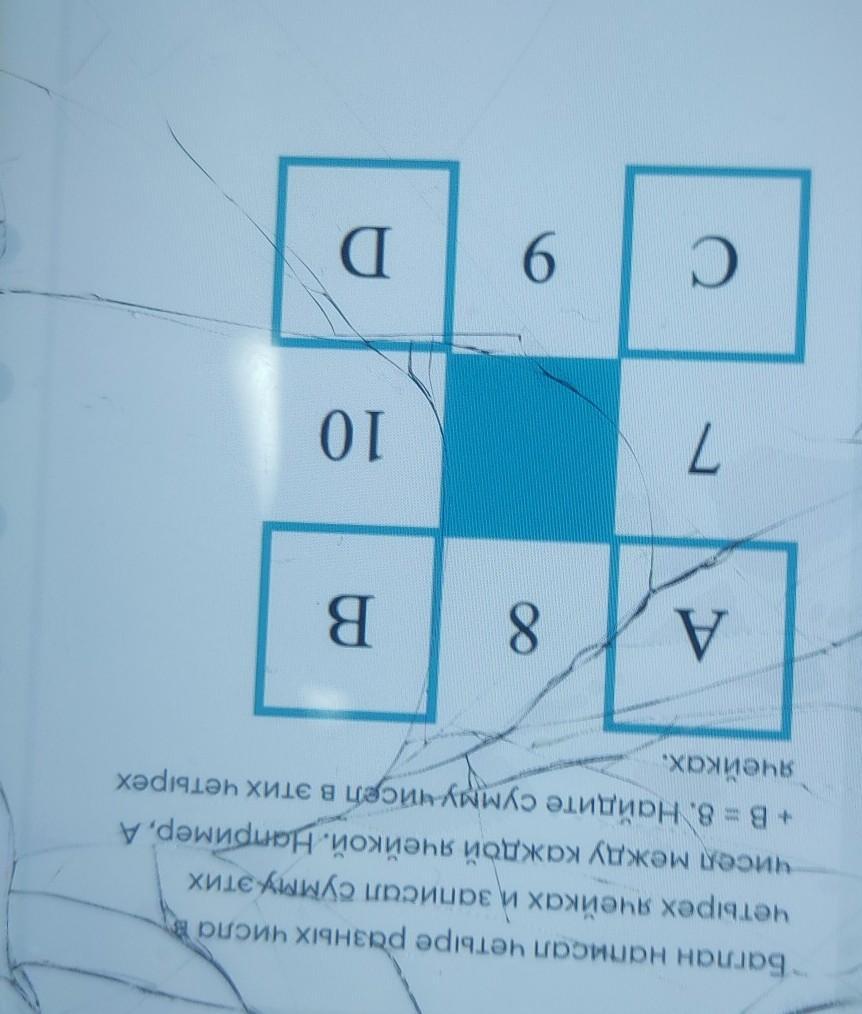 Баглан написал четыре разных числа в четырех ячейках и записал сумму әтих чисел между каждой ячейкой. Например, А +в= 8. Найдите сумму чисел в этих четырех ячейках. A 7 C 8 B 9 10 D Оди