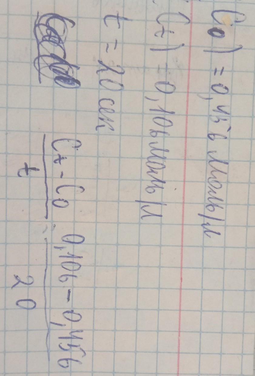 Реакция протекает по уравнению А+В-2С. Начальная концентрация вещества равна 0,456 моль/л, а через 20 секунд 0,106 моль/л. Вычислите среднюю скорость реакции.
