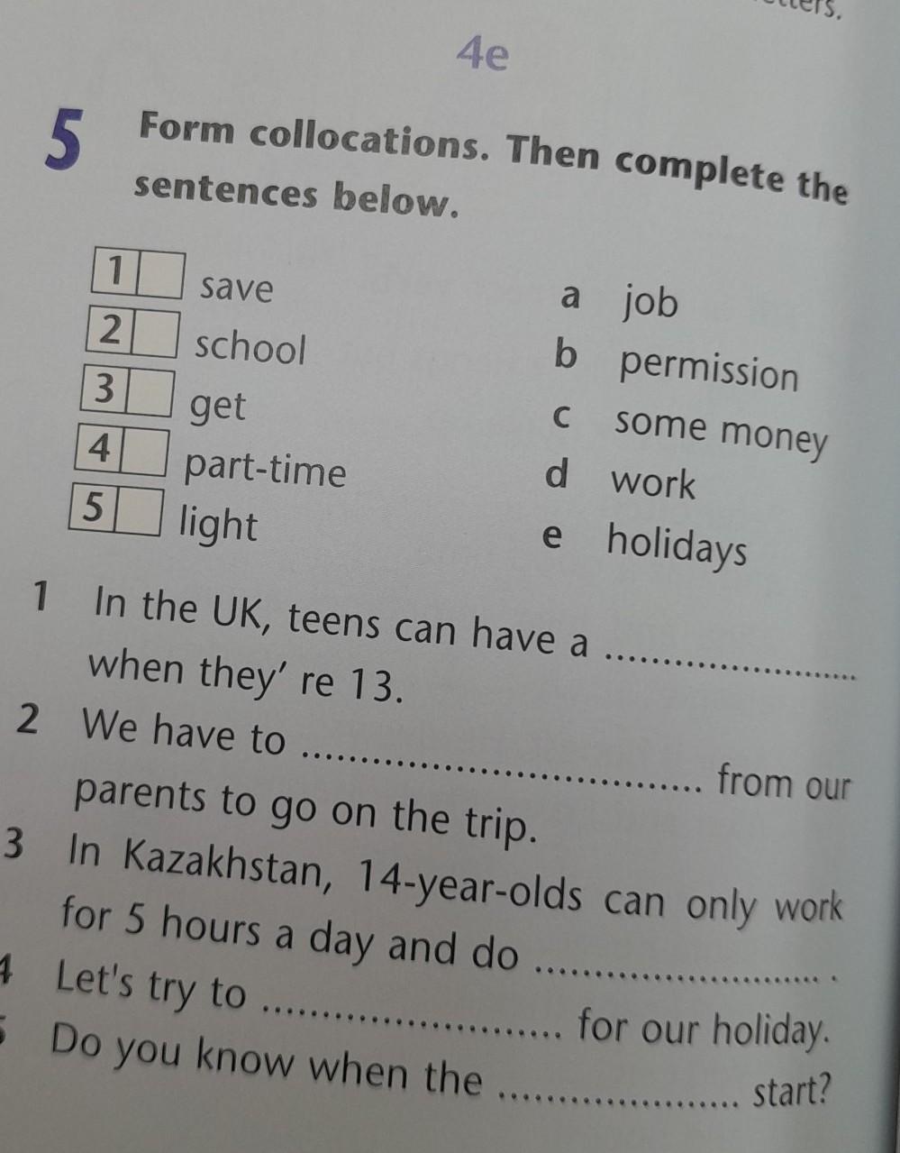 r David mercials pice is 1 In the UK, teens can have a when they' re 13. 2 We have to ...... from our parents to go on the trip. 3 In Kazakhstan, 14-year-olds can only work for 5 hours a day and do ......... 4 Let's try to ..... ... for our holiday. 5 Do you know when the ....... start? 13