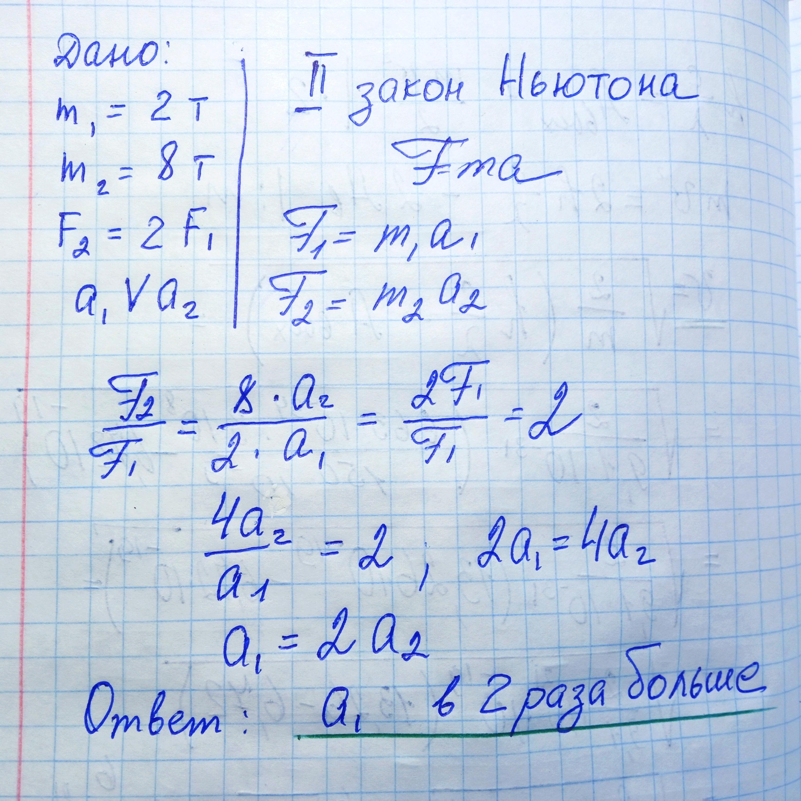 Масса легкового автомобиля 2 тонны, грузового 8 тонн. Тяговая сила грузового автомобиля в 2 раза больше, чем у легкового автомобиля, сравните их ускорение.