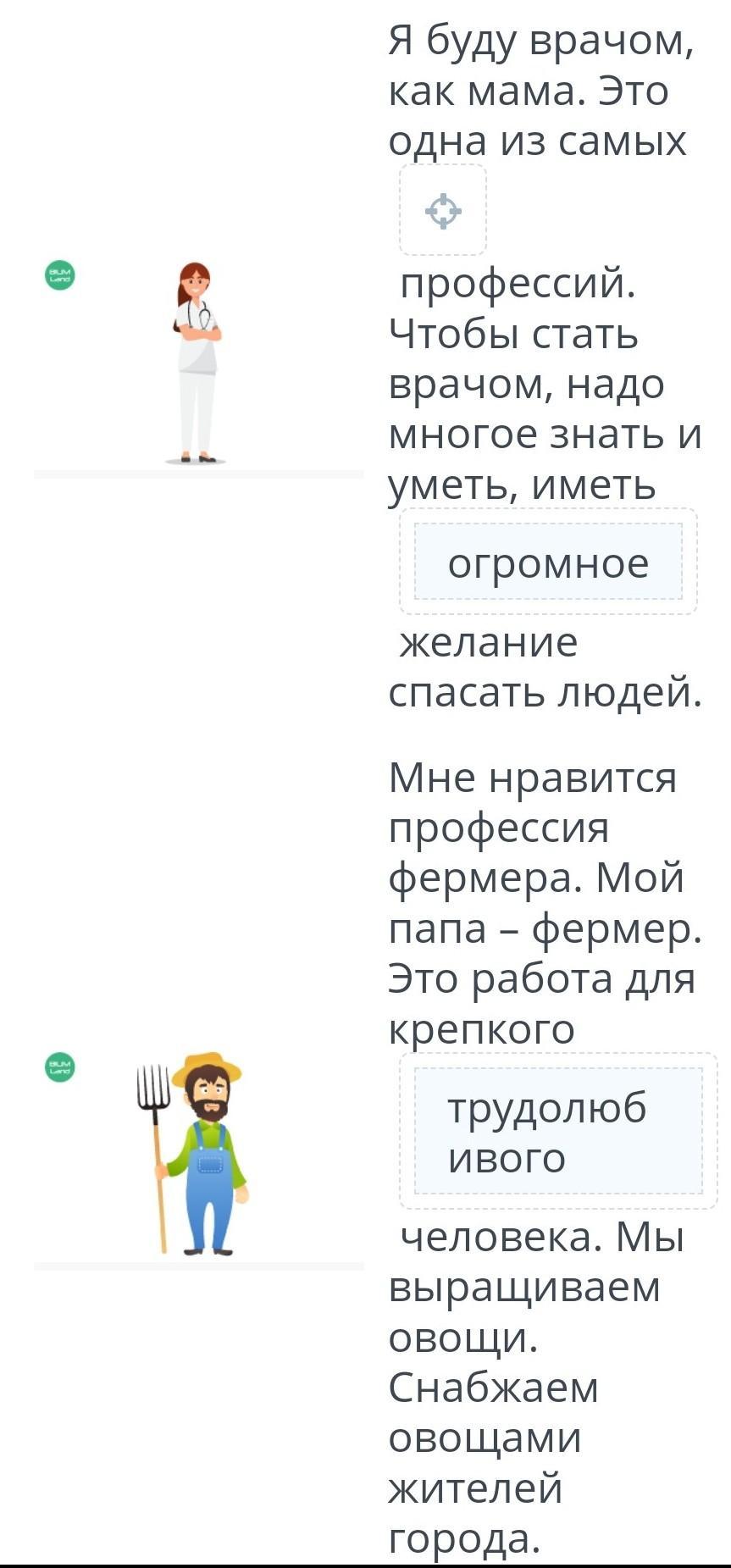 2. Мне нравится **увлекательная** профессия фермера. Мой папа – фермер. Это работа для **сильного** трудолюбивого человека. Мы выращиваем овощи. Снабжаем овощами жителей города.