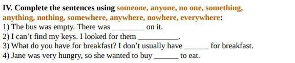 1) The bus was empty. There was 2) I can't find my keys. I looked for them 3) What do you have for breakfast? I don't usually have. 4) Jane was very hungry, so she wanted to buy. to eat. on it. for breakfast.