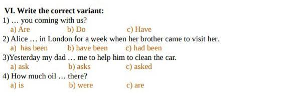 VI. Write the correct variant: 1)... you coming with us? a) Are b) Do c) Have 2) Alice... in London for a week when her brother came to visit her. a) has been b) have been c) had been 3) Yesterday my dad... me to help him to clean the car. a) ask b) asks c) asked 4) How much oil... there? a) is b) were c) are