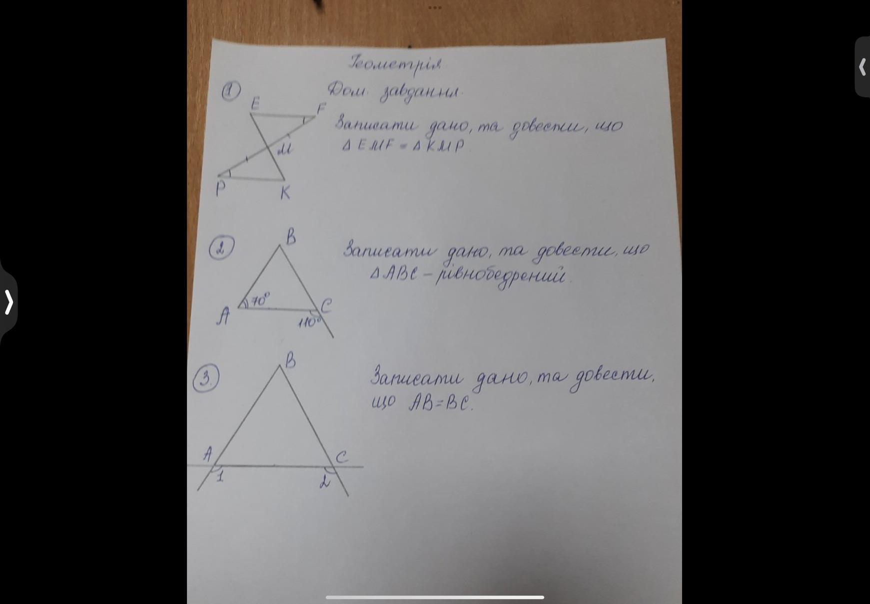 Якщо MF = MP, <F = <P, <EMF = <KMP (бо вертикальні кути рівні), то ∆EMF = ∆KMP за стороною та прилеглими до неї кутами (друга ознака рівності трикутників). Доведено.