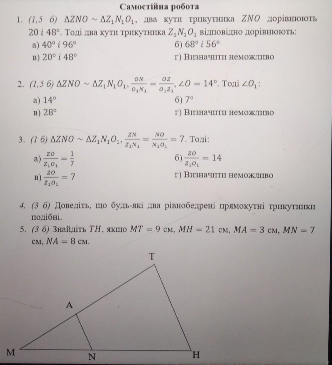 1)Для трикутника ZNO з кутами 20° і 48°, кути трикутника Z₁₁₁ відповідно будуть: