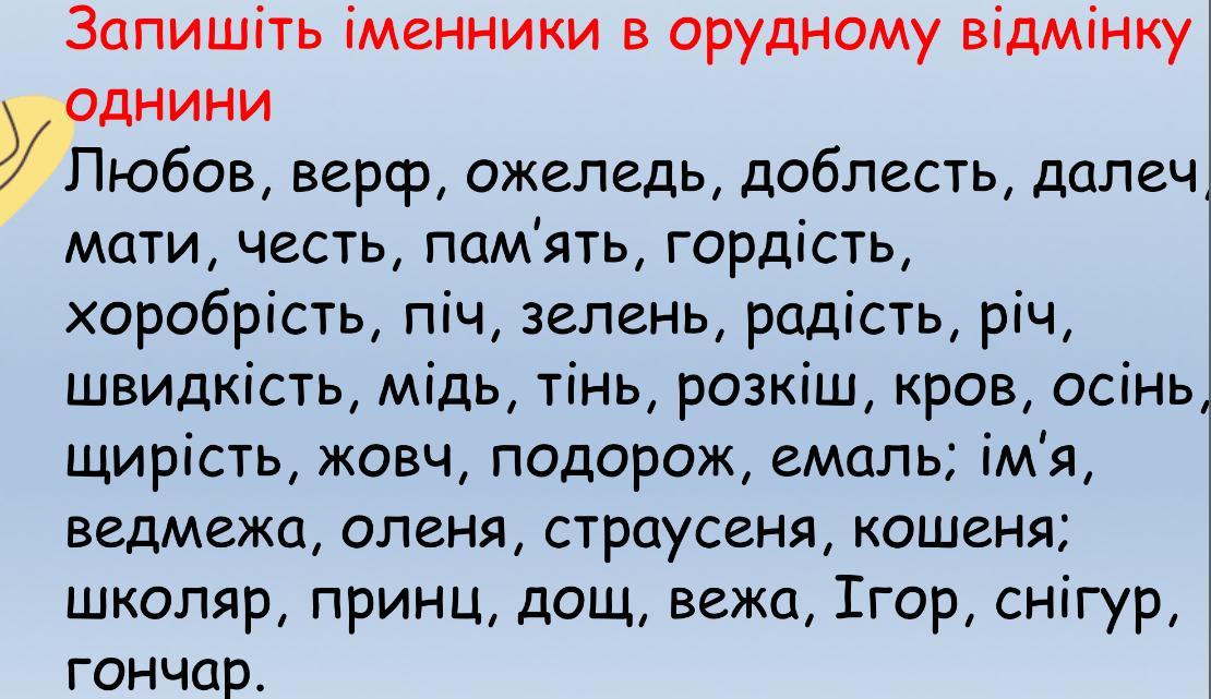 Любов'ю, верф'ю, ожеледдю, доблестю, матір'ю, честю, пам'яттю, гордістю, хоробрістю, піччю, зеленню, радістю, річчю, швидкістю, міддю, тінню, розкішшю, ім'ям, оленем, страусеням, школярем, принцес, ігорем, гончарем.