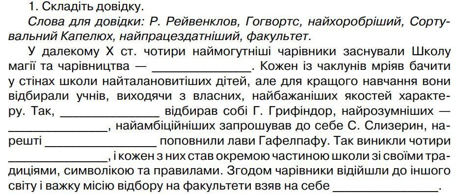 1. Складіть довідку. Слова для довідки: Р. Рейвенклов, Гогвортс, найхоробріший, Сорту- вальний капелюх, найпрацездатніший, факультет. У далекому Х ст. чотири наймогутніші чарівники заснували Школу магії та чарівництва Кожен із чаклунів мріяв бачити у стінах школи найталановитіших дітей, але для кращого навчання вони відбирали учнів, виходячи з власних, найбажаніших якостей характе- ру. Так, відбирав собі Г. Грифіндор, найрозумніших найамбіційніших запрошував до себе с. Слизерин, на- решті поповнили лави Гафелпафу. Так виникли чотири , і кожен з них став окремою частиною школи зі своїми тра- диціями, символікою та правилами. Згодом чарівники відійшли до іншого світу і важку місію відбору на факультети взяв на себе 3 - -