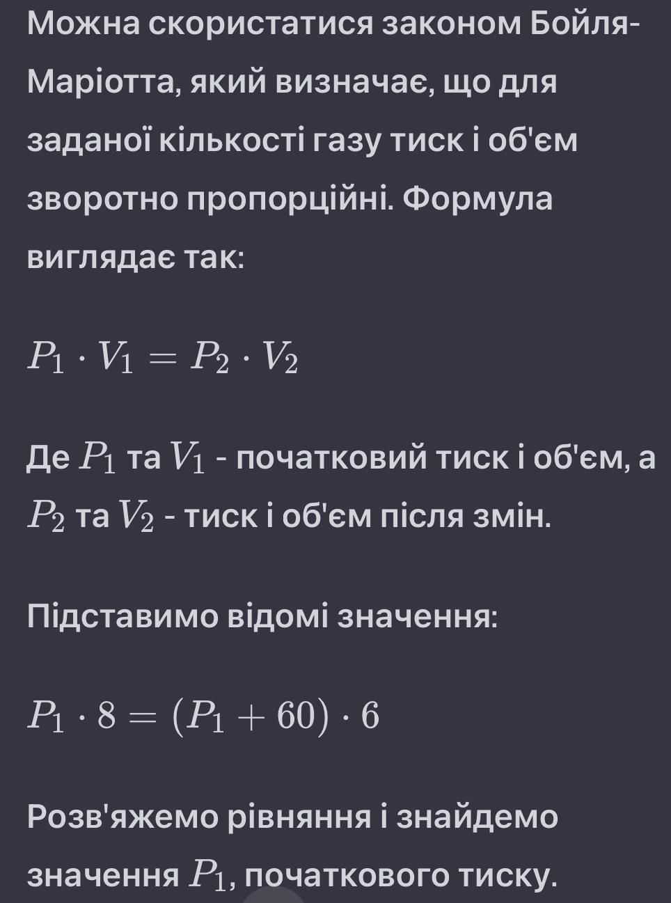 При стиску газу його об'єм зменшився з 8 до 6 л, а тиск підвищився на 60 кПа. Знайти початковий тиск.
