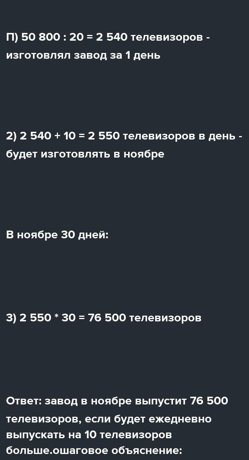 9 Реши задачу. Выпуская в день одинаковое количество те- левизоров, завод изготовил за 20 дней 50 800 телевизоров. Сколько телевизоров выпу- стит завод за ноябрь месяц, если он ежеднев- но будет выпускать на 10 телевизоров больше?фотом