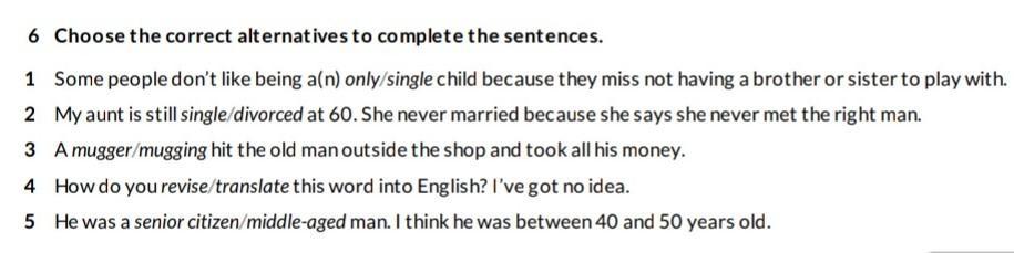 6 Choose the correct alternatives to complete the sentences. 1 Some people don't like being a(n) only/single child because they miss not having a brother or sister to play with. 2 My aunt is still single/divorced at 60. She never married because she says she never met the right man. 3 A mugger/mugging hit the old man outside the shop and took all his money. 4 How do you revise/translate this word into English? I've got no idea. 5 He was a senior citizen/middle-aged man. I think he was between 40 and 50 years old.
