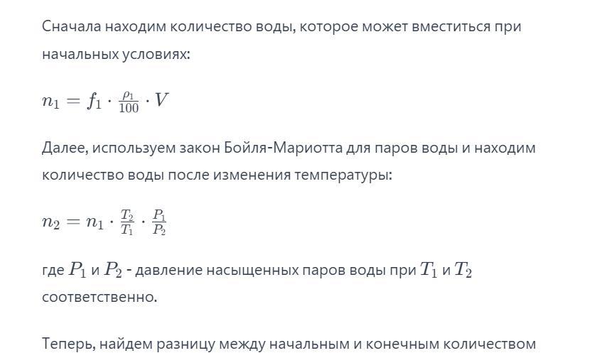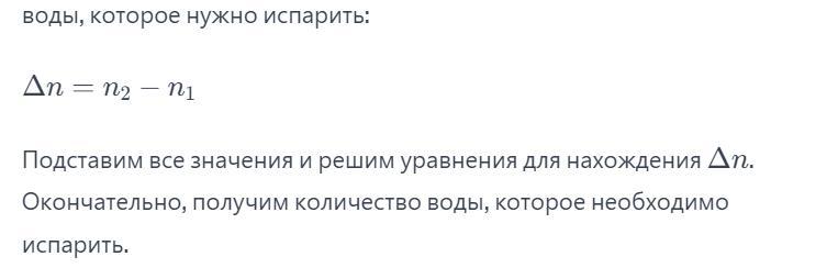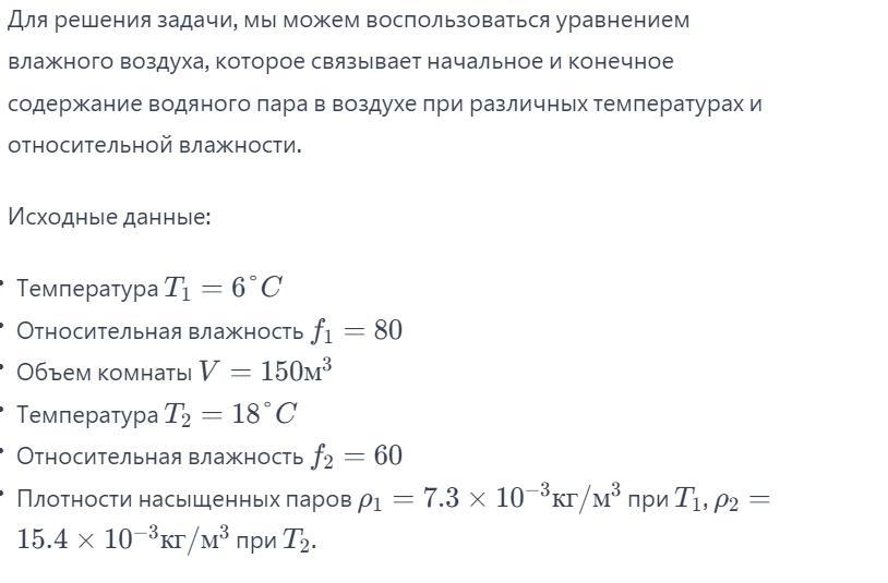Ответ: Температура воздуха в комнате объемом 150 м3 равна 6°С, относительная влажность 80%. Сколько воды нужно испарить в этой комнате, чтобы при увеличении температуры до 18°С относительная влажность стала равна 60%? Плотности насыщающих паров воды при этих температурах равны соответственно 7.3 × 10^-3 и 15,4 × 10^-3 кг/м3