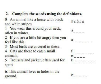 2. Complete the words using the definitions. 0 An animal like a horse with black and white stripes. 1 You wear this around your neck, often in winter. 2 If you are a little bit angry then you feel like this. 3 Most birds are covered in these. 4 Cats use these to catch small animals. 5 Trousers and jacket, often used for sport 6. This animal lives in holes in the ground. zebra scanf feathers claws t