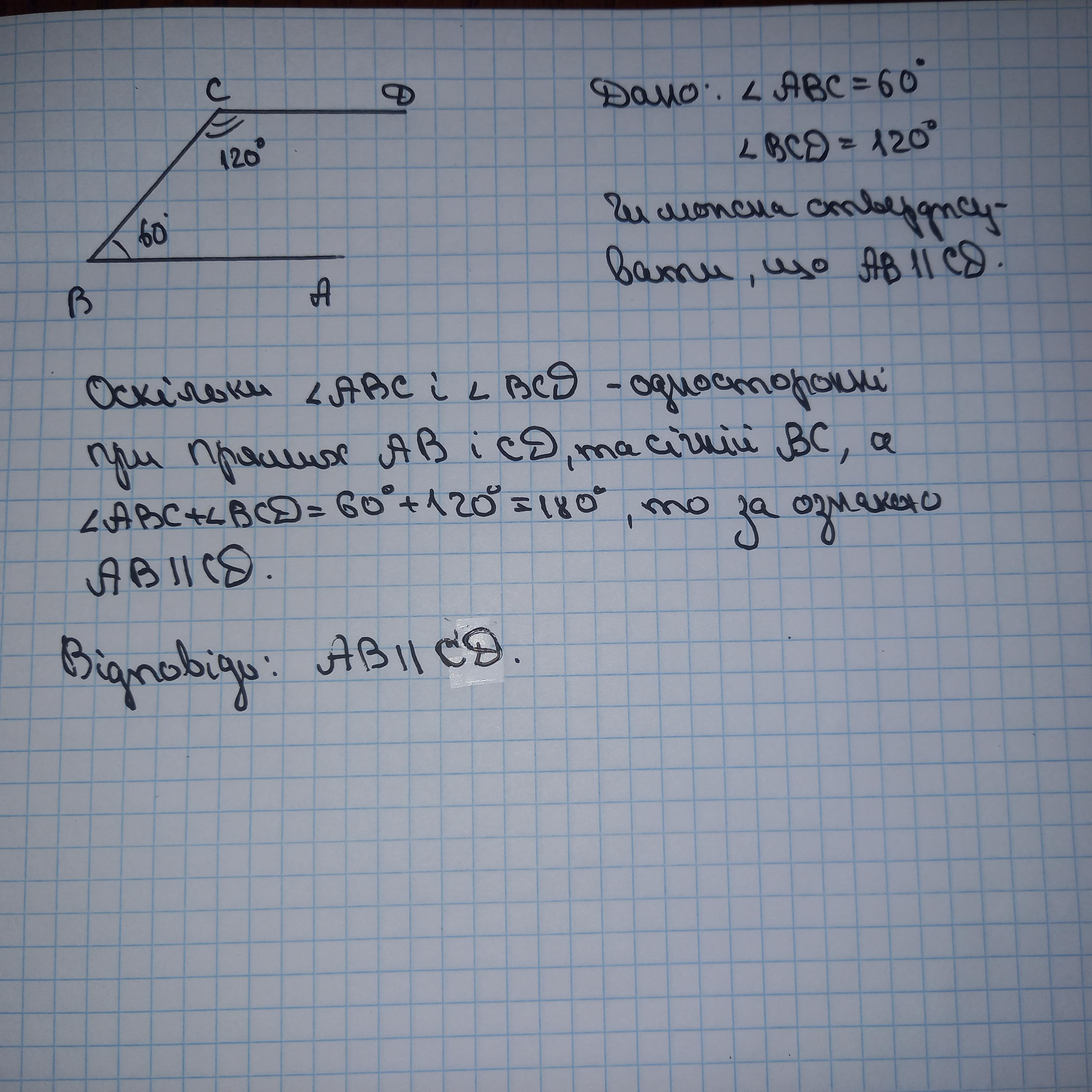 317." Кут АВС дорівнює 60°, а кут BCD - 120°. Чи можна стверджувати, що прямі АB і CD паралельні?