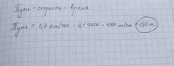 Мотоциклист равномерно едет со скоростью 1,7 км/мин в течение 0,1 часа.