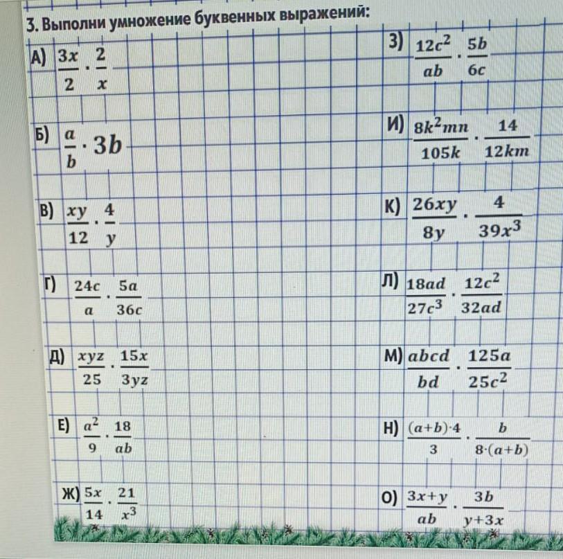 3. Выполни умножение буквенных выражений: A) 3x 2 1- 2 x Б) a .3b b B) xy 4 I- 12 У г) 24c a . Д) xyz 15x 25 Зуz Ж) 5x 5a 36с W E) a² 18 9 ab I 21 14 x3 3) 12c² 5b ab бс И) 8k2mn 14 105k 12km К) 26ху 8y . Л) 18ad 12c² 27c3 32ad H) (a+b)-4 3 4 39x3 M) abcd 125a bd 25c2 0) 3x+y ab b 8-(a+b) 3b y+3x