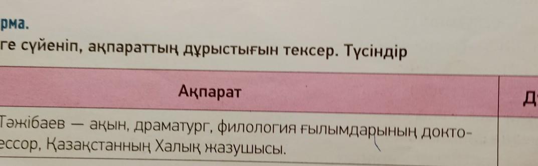 ОКЫЛЫМ 4 -тапсырма. Мәтінге сүйеніп, ақпараттың дұрыстығын тексер. Түсіндір Ақпарат Әбділда Тәжібаев - ақын, драматург, филология ғылымдарының докто ры, профессор, Қазақстанның Халық жазушысы Дурыс