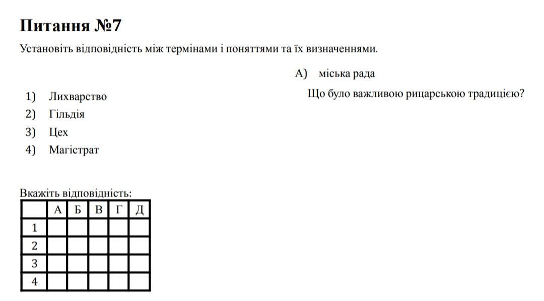 **Г)** **Цех** - це об'єднання ремісників однієї галузі в межах одного міста. **Міська рада** - це орган місцевого самоврядування, який представляє інтереси громади міста. Ці два терміни не пов'язані між собою. Тому відповідність **Г)** є невірною.