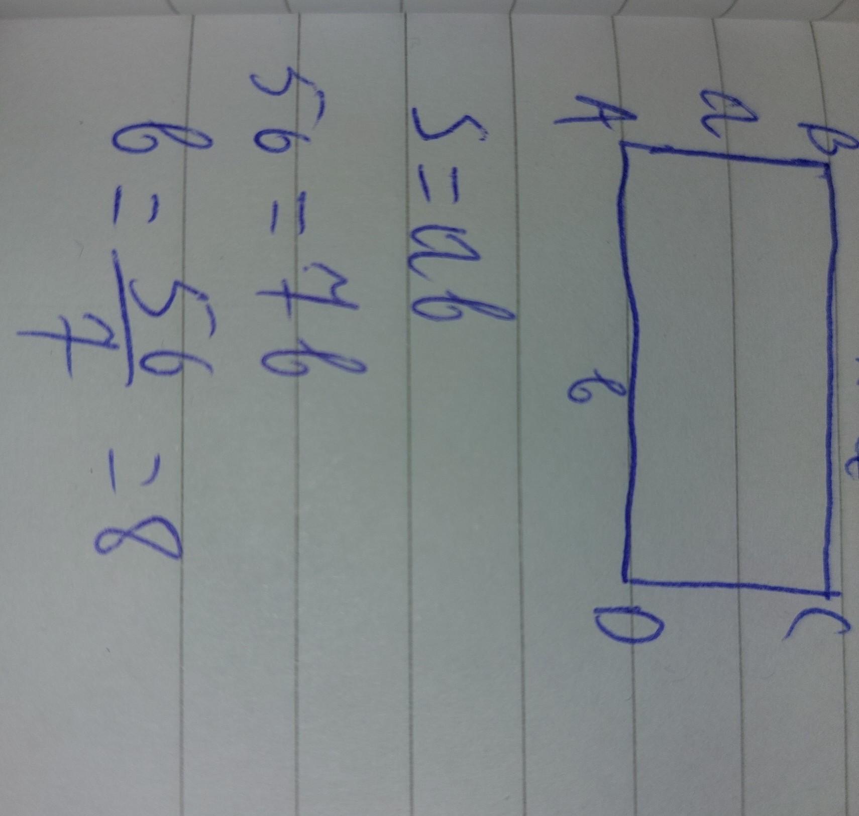 Площадь прямоуголника это S=ab, a=7, S=56, подставляем то, что имеем, в уравнение и получаем 8.