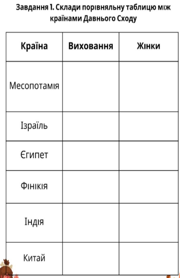 | Єгипет | Вищий клас - література та мистецтво, рабовласницька система | Велика роль в сім'ї та вихованні дітей |