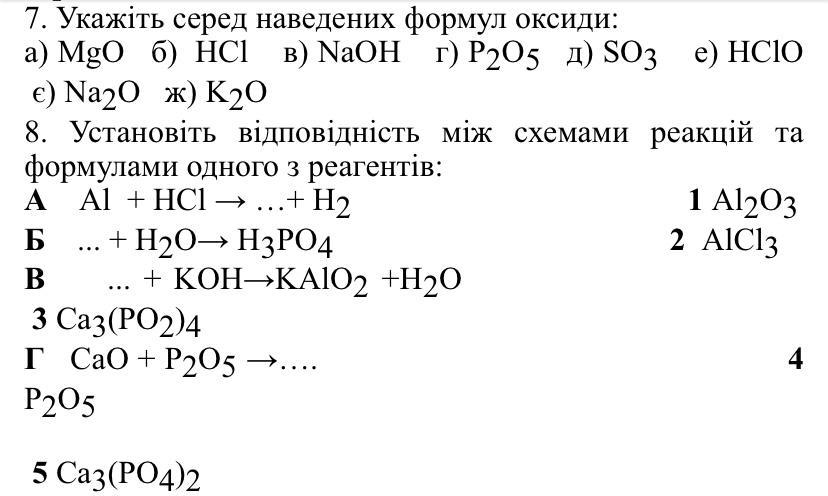 Объяснение: 7. Сполука NaOH є гідроксидом, тому її не можна вважати за формулу оксиду.