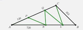 Воспользуемся одним из возможных способов решения этой задачи. Вспомним такую формулу для вычисления площади треугольника: половина произведения двух сторон треугольника и синуса угла между ними. Мы будем применять эту формулу для треугольников APK, AQK, AQL, ACL, ACB. У всех указанных треугольников общий угол A, поэтому отношение их площадей будет равно отношению произведений прилежащих сторон.