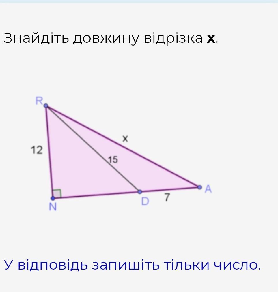 3) за теоремою піфагора х буде дорівнювати квадратний корінь із суми катетів RN і NA