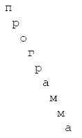 2. Внешний цикл перебирает номера символов строки от первого до последнего. В теле цикла вложенный оператор цикла выдает на экран i-1 пробел, где i — номер символа, затем выводится на экран сам символ с переходом на другую строку. В результате символы строки выдаются лесенкой, что и будет отражено на экране: