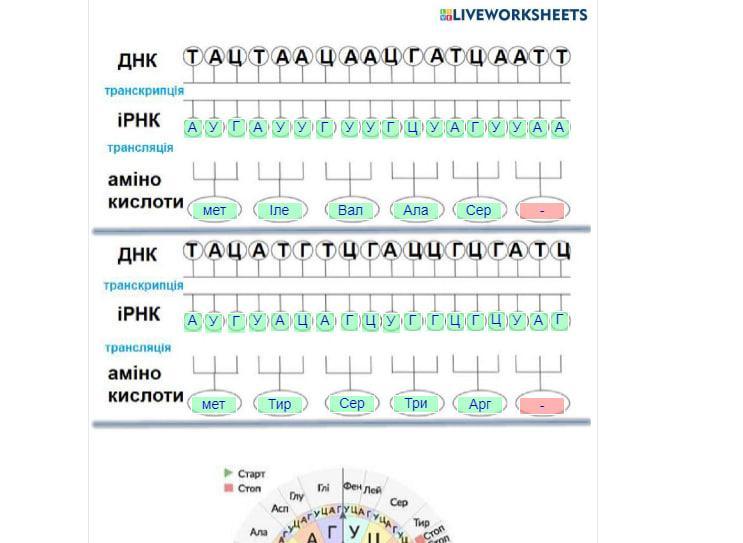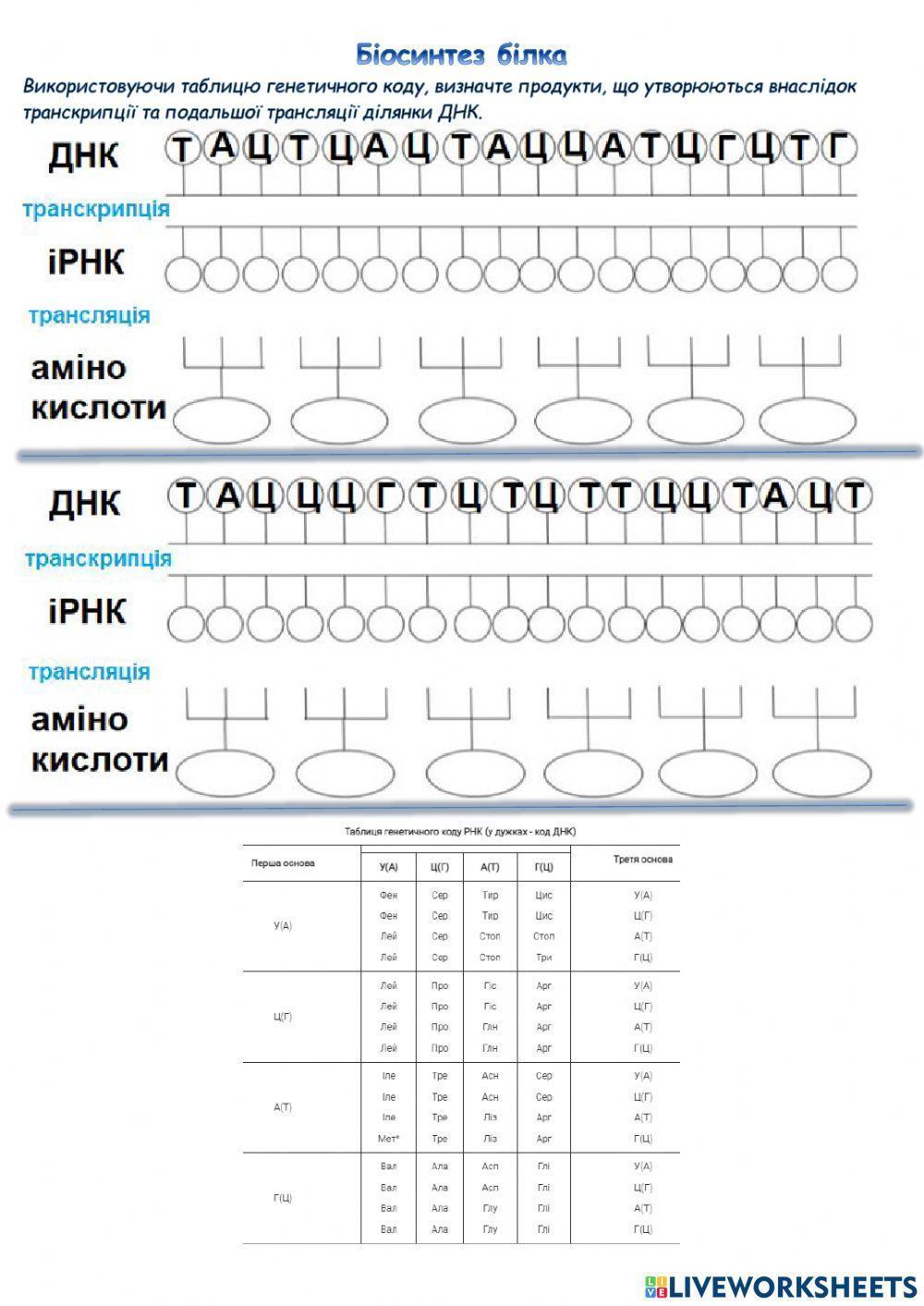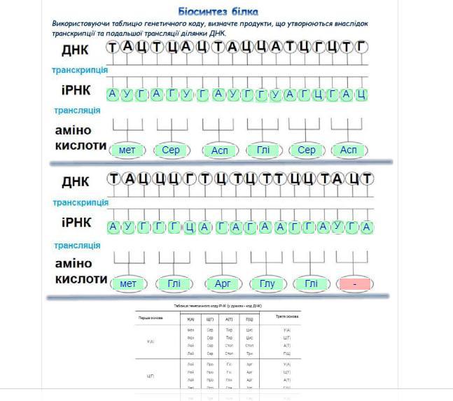Використовуючи таблицю генетичного коду, визначне послідовність амінокислот у білковій молекулі.