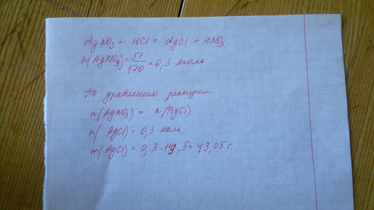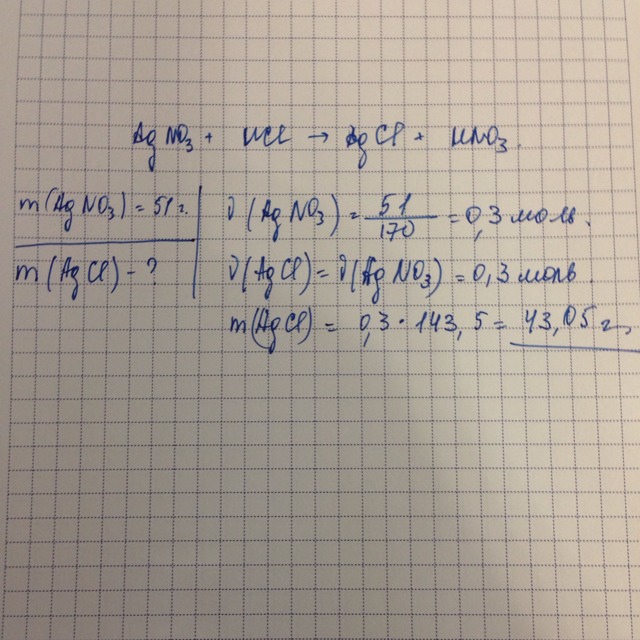Какая масса AgCl образовалась в реакции 51 грамм AgNO3 с HCl ?