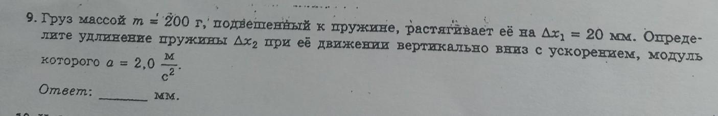 Груз массой **m = 200 г**, подвешенный к пружине, растягивает её на **Δx₁ = 20 мм**. Определите удлинение пружины **Δx** при её движении вертикально вниз с ускорением, модуль которого **a = 2,02 м/с²**.