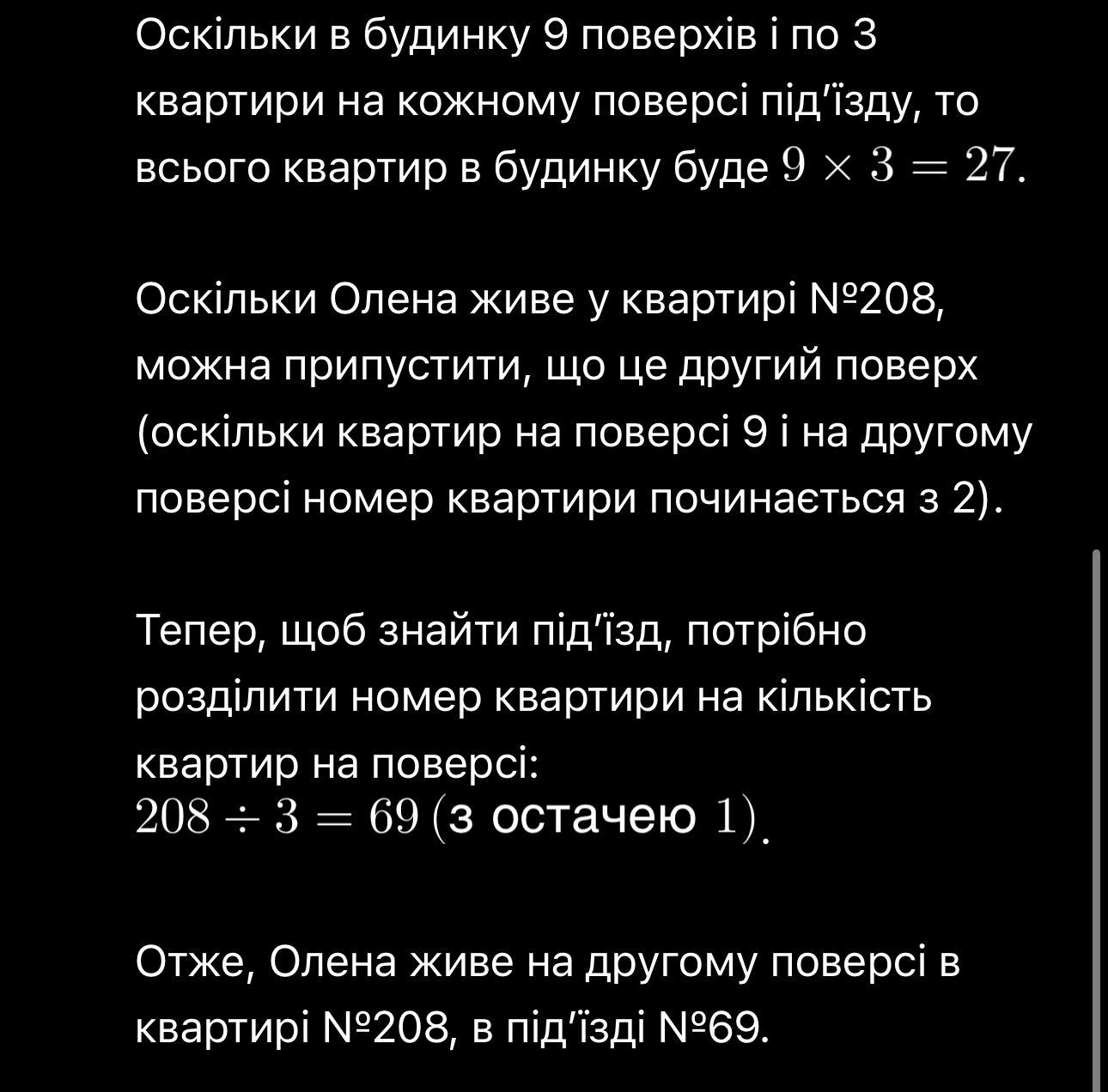 6. Олена живе у квартирі №208 . У її будинку 9 поверхів, по 3 квартири на кожному поверсi пiд'їзду. У якому під'їзді і на якому поверсі живе Олена?