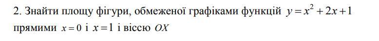 Знайти площу фігури, обмеженої графіками функцій ............. прямими ......... і .......... і віссю ....... .