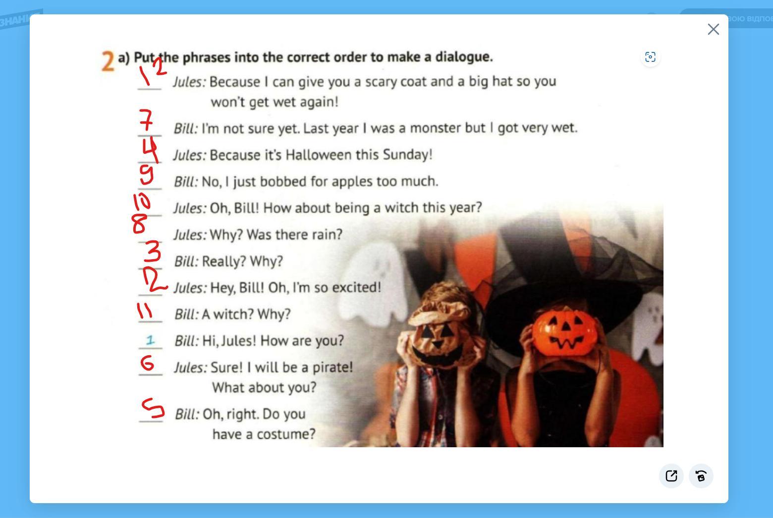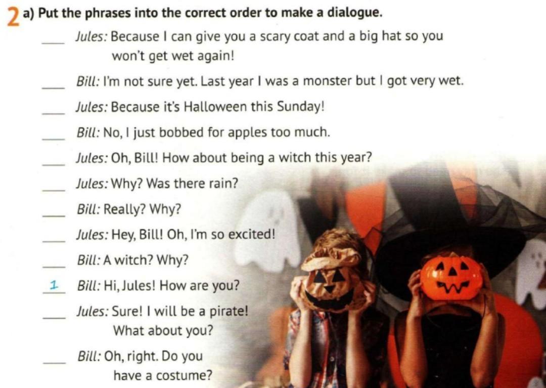 . 1. Bill: Hi, Jules! How are you? 2. Jules: Hey, Bill! Oh, I’m so excited! 3. Bill: Really? Why? 4. Jules: Because it’s Halloween this Sunday! 5. Bill: Oh, right. Do you have a costume? 6. Jules: Sure! I will be a pirate! What about you? 7. Bill: I’m not sure yet. Last year I was a monster but I got very wet. 8. Jules: Why? Was there rain? 9. Bill: No, I just bobbed for apples too much. 10. Jules: Oh, Bill! How about being a witch this year? 11. Bill: A witch? Why? 12. Jules: Because I can give you a scary coat and a big hat so you won't get wet again!