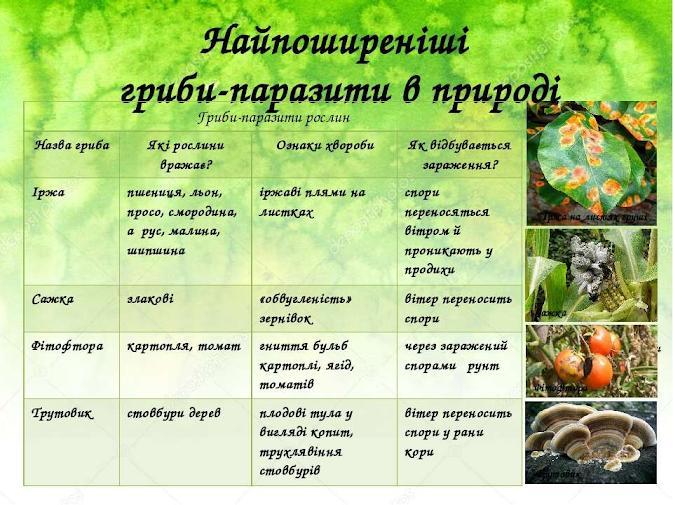 Серед грибів чимало паразитів. Вони викликають різні хвороби рослин, тварин і людини.