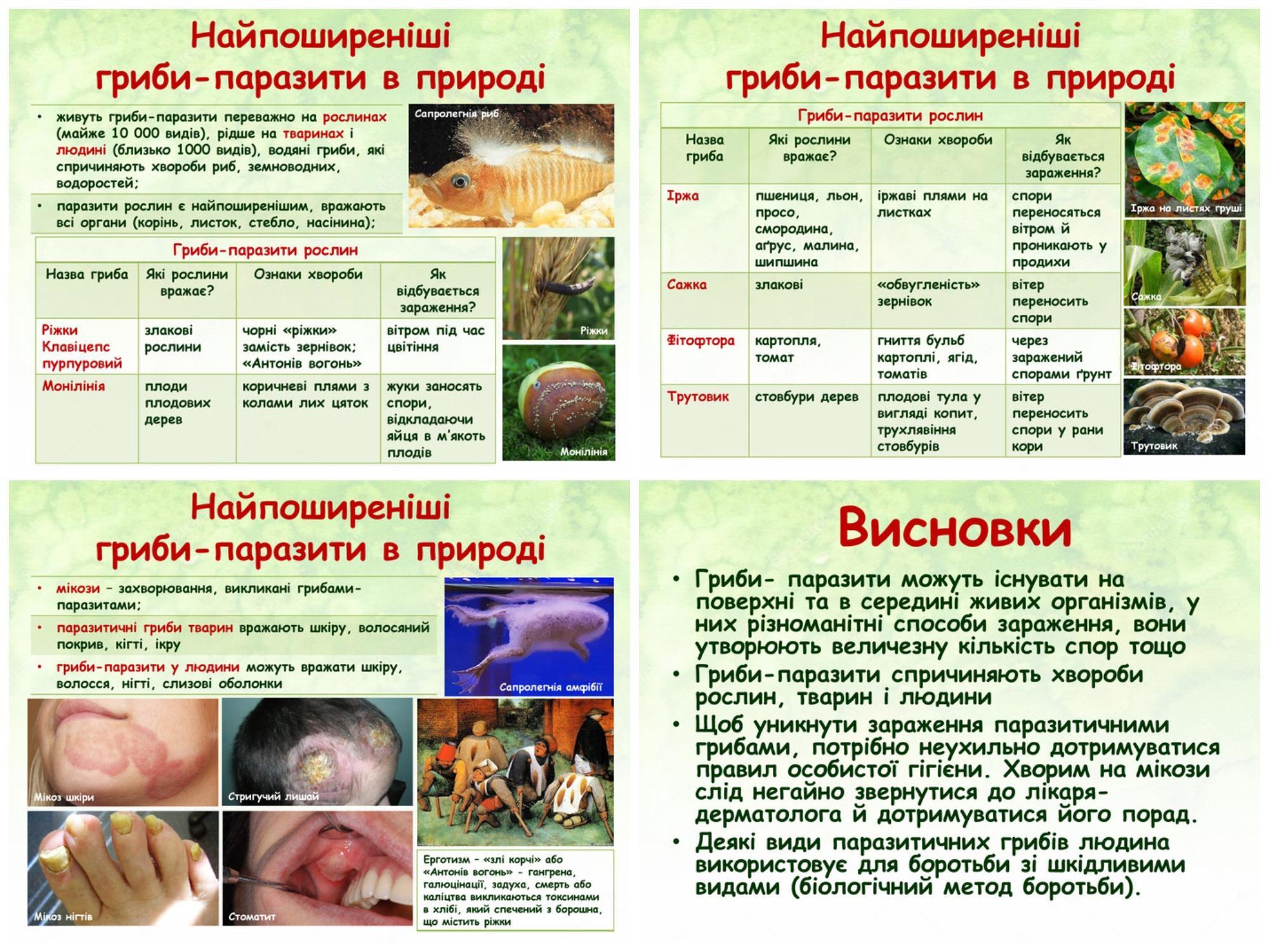 Ознайомтеся з паразитичними представниками Царства Гриби. Заповніть таблицю: "Гриби-паразити" | Представники Захворювання, шкода іншим організмам