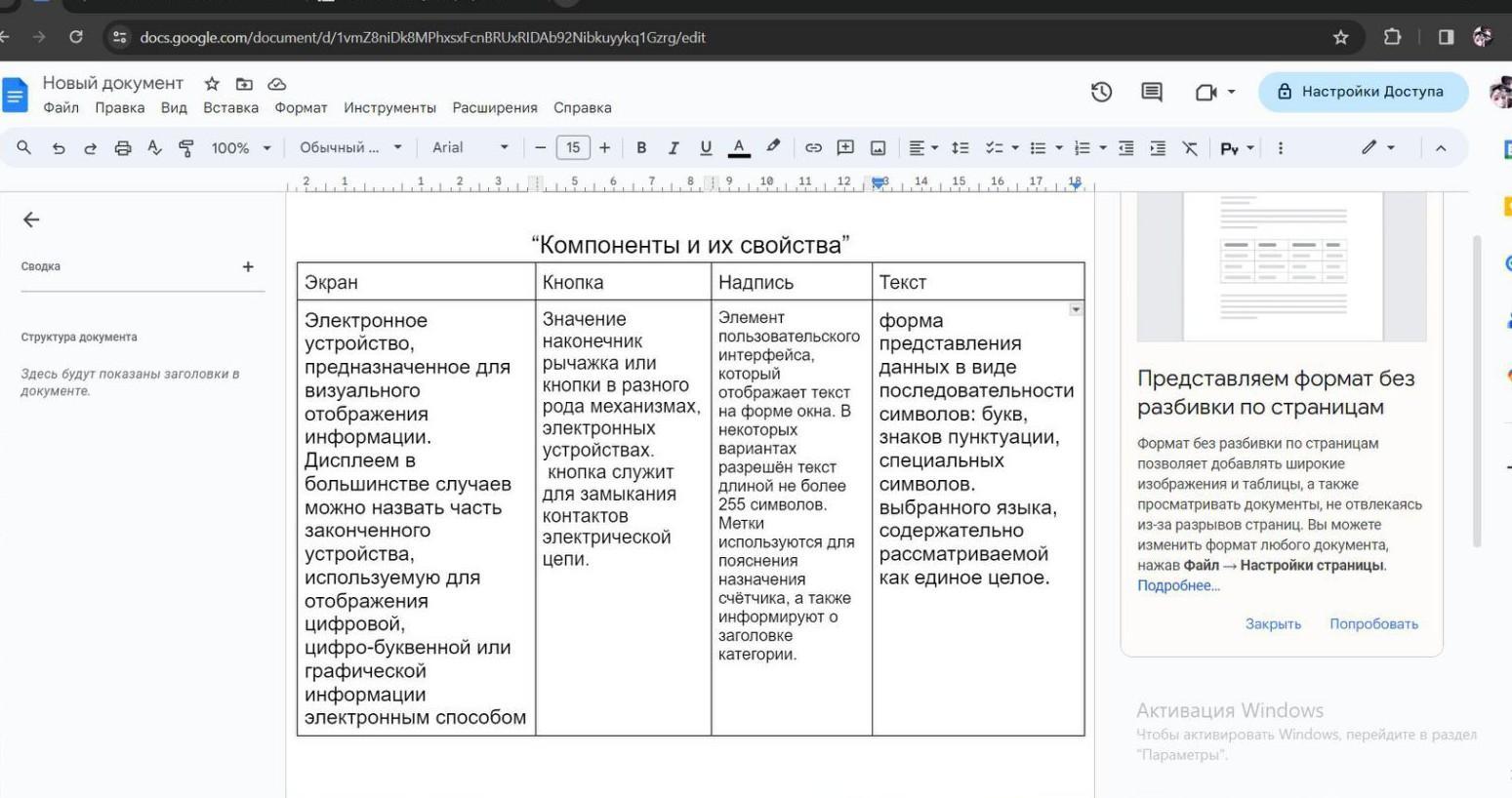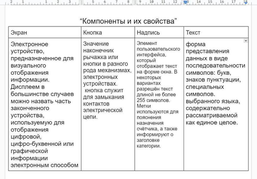 Заполните таблицу «Компоненты и их свойства» для следующих компонентов: Экран, Кнопка, Надпись, Текст, указав не менее 5 основных свойств компонентов и их возможные значения.