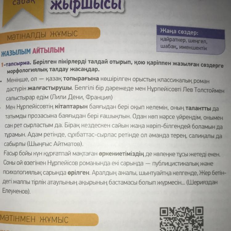 1-тапсырма. Берілген пікірлерді талдай отырып, қою карiппен жазылған сездерге