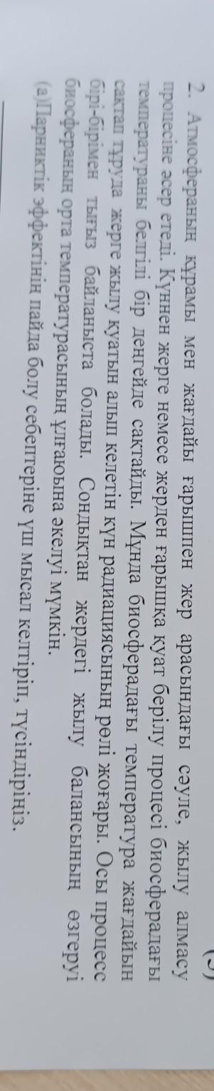 (5) 2. Атмосфераның құрамы мен жағдайы ғарышпен жер арасындағы сәуле, жылу алмасу процесіне әсер етеді. Күннен жерге немесе жерден ғарышқа қуат берілу процесі биосферадағы температураны белгілі бір деңгейде сақтайды. Мұнда биосферадағы температура жағдайын сактап тұруда жерге жылу куатын алып келетін күн радиациясының рөлі жоғары. Осы процесс бірі-бірімен тығыз байланыста болады. Сондықтан жердегі жылу балансының өзгеруі биосферанын орта температурасының ұлғаюына әкелуі мүмкін. (а)Парниктік эффектінін пайда болу себептеріне үш мысал келтіріп, түсіндіріңіз. 3.Тенер