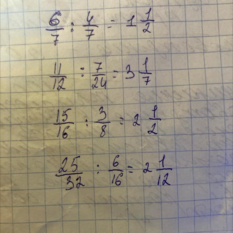6/7 : 4/7 = 6/7 * 7/4 = 3/1 * 1/2 = 3/2 = 1 1/2