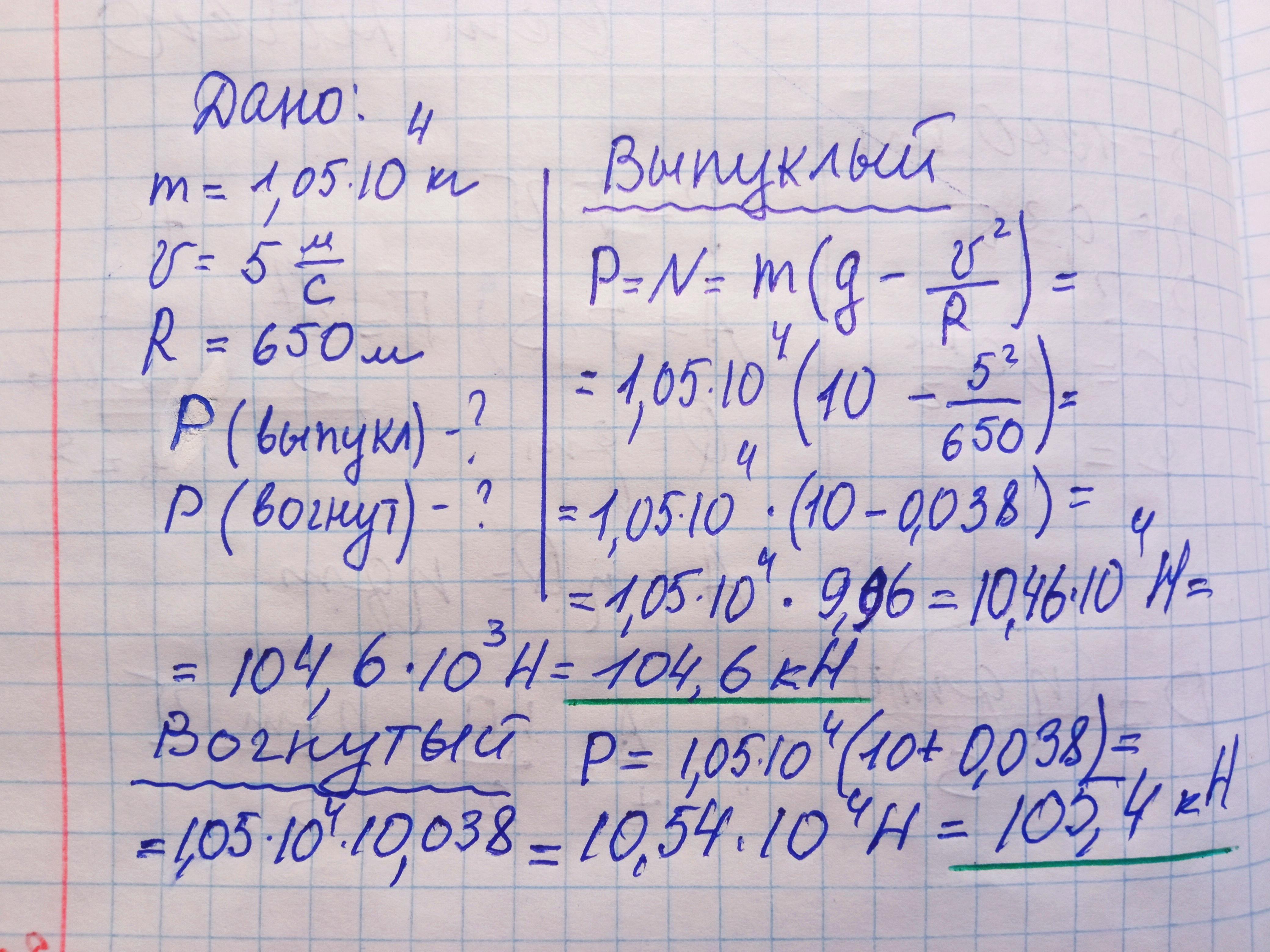 3. Советская самоходная артиллерийская установка СУ-5, боевая масса которой равна 10500 кг, движется по мосту со скоростью 5 м/с. Радиус кривизны моста составляет 650 м. Найдите силу, с которой СУ-5 действует на середину моста, если мост: а) выпуклый; б) вогнутый.
