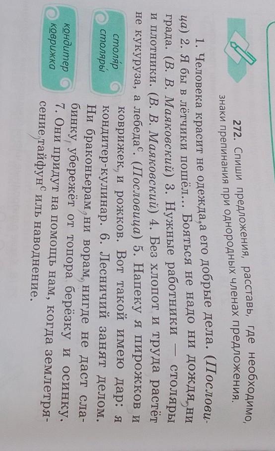 272. Спиши предложения, расставь, где необходимо, знаки препинания при однородных членах предложения. столяры 1. Человека красит не одежда,а его добрые дела. (Послови- ца) 2. Я бы в лётчики пошёл... Бояться не надо ни дождя ни града. (В. В. Маяковский) 3. Нужные работники и плотники. (В. В. Маяковский) 4. Без хлопот и труда растёт не кукуруза, а лебеда“. (Пословица) 5. Напеку я пирожков и коврижек и рожков. Вот такой имею дар: я кондитер-кулинар. 6. Лесничий занят делом. Ни браконьерам ни ворам, нигде не даст сла- бинку, убережёт от топора берёзку и осинку. 7. Они придут на помощь нам, когда землетрясение тайфун или наводнение.