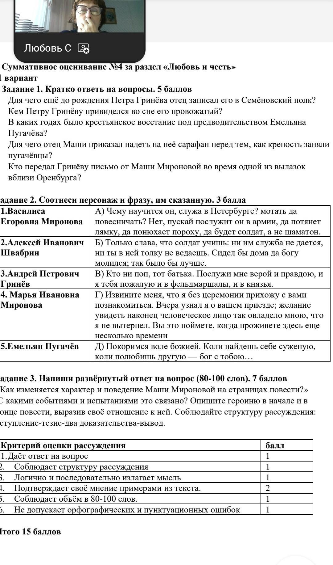Задание 1. Кратко ответь на вопросы. 5 баллов Для чего ещё до рождения Петра Гринёва отец записал его в Семёновский полк? Кем Петру Гринёву привиделся во сне его провожатый? В каких годах было крестьянское восстание под предводительством Емельяна Пугачёва? Для чего отец Маши приказал надеть на неё сарафан перед тем, как крепость занялі пугачёвцы? Кто передал Гринёву письмо от Маши Мироновой во время одной из вылазок вблизи Оренбурга?