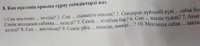 8. Коп нүктенің орнына сұрау есімдіктерді жаз. 1.Сен мектепке келдiн? 2. Сен ... сыныпта окисын? 3. Сендерде дүйсенбі ку Сенiн жолдасын сабакка ... келеді? 5. Сенiн ... кітабын бар? 6. Сен ... жылы ту келедi? 8. Сен ... жастасын? 9. Сенiн үйiн ... кешеде, номiрi ... 10. Мектепте ***