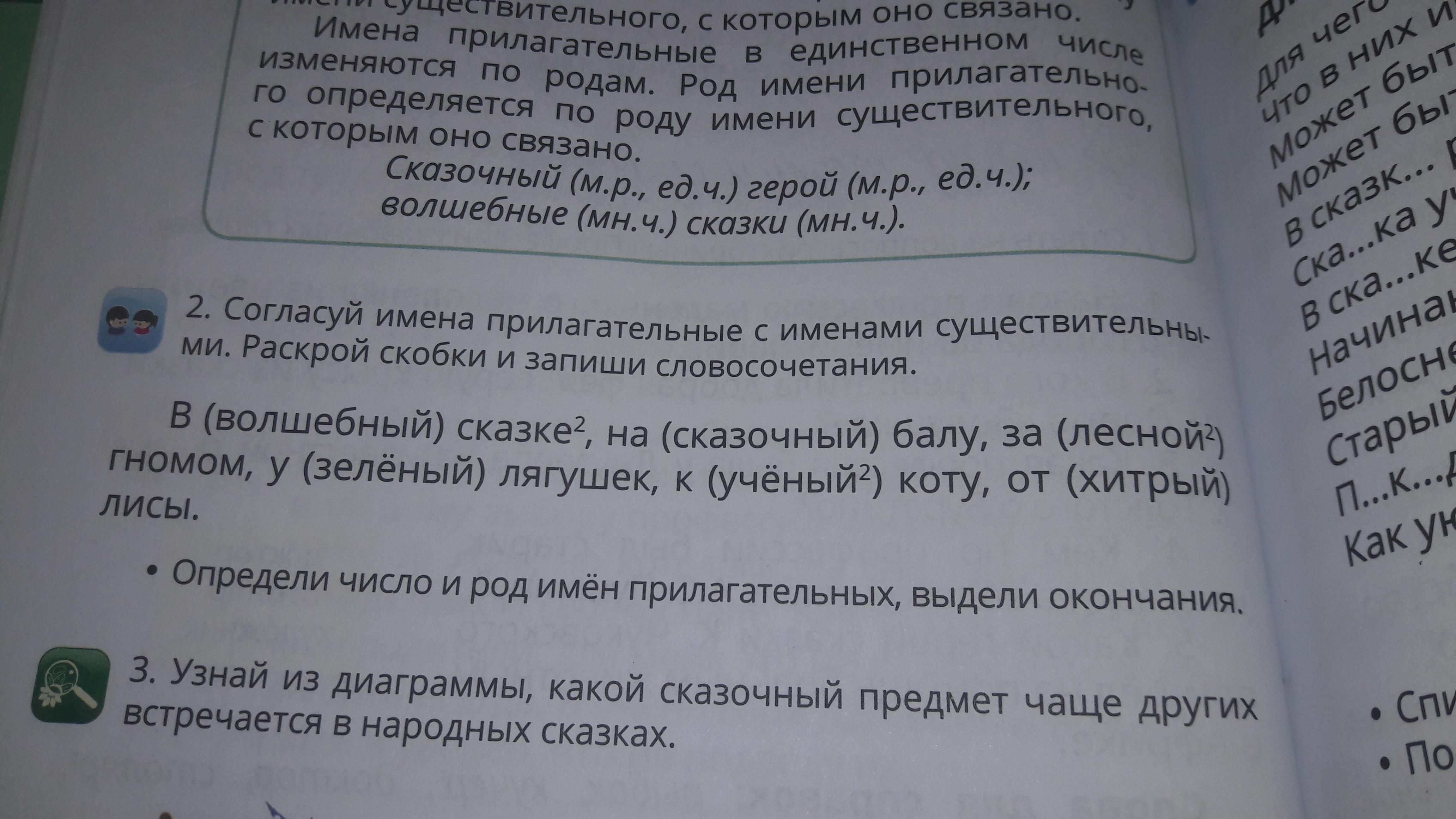 В волшебной (ед.ч., ж.р., ой-окончание) сказке, на сказочном(ед.ч., м.р., ом-окончание) балу, за лесным(ед.ч., м.р., ым-окончание) гномом, у зеленых(мн.ч., ых-окончание) лягушек, к учёному(м.р., ед.ч., ому-окончание) коту, от хитрой(ж.р., ед.ч., ой-окончание) лисы.