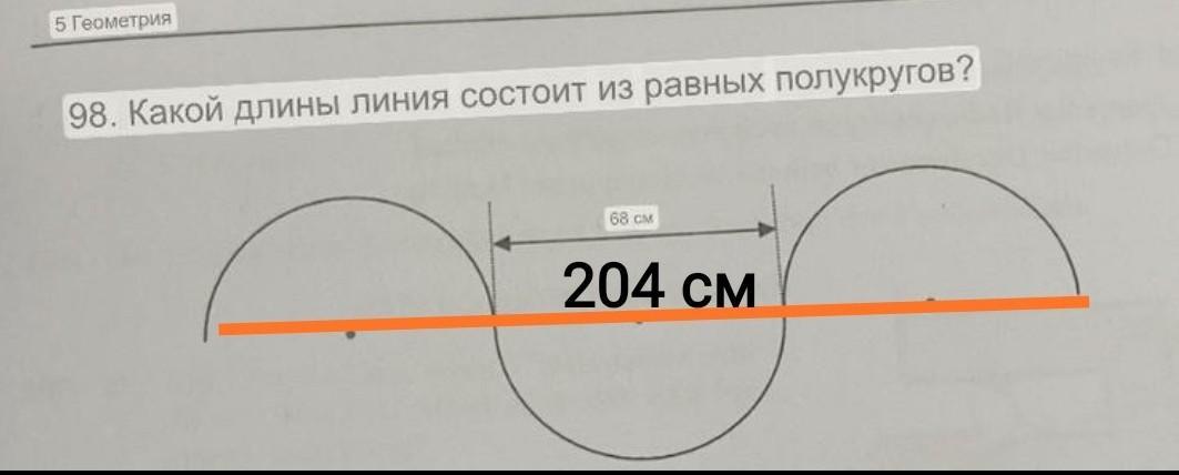 Если все три полукруга равны, их диаметр равен 68 см, то длина линии равна: 68 * 3 = 204 см