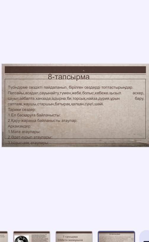 2)Қару-жараққа байланысты атаулар:жебе,сауыт,айбалта,найза,қалқан,сүңгі;
