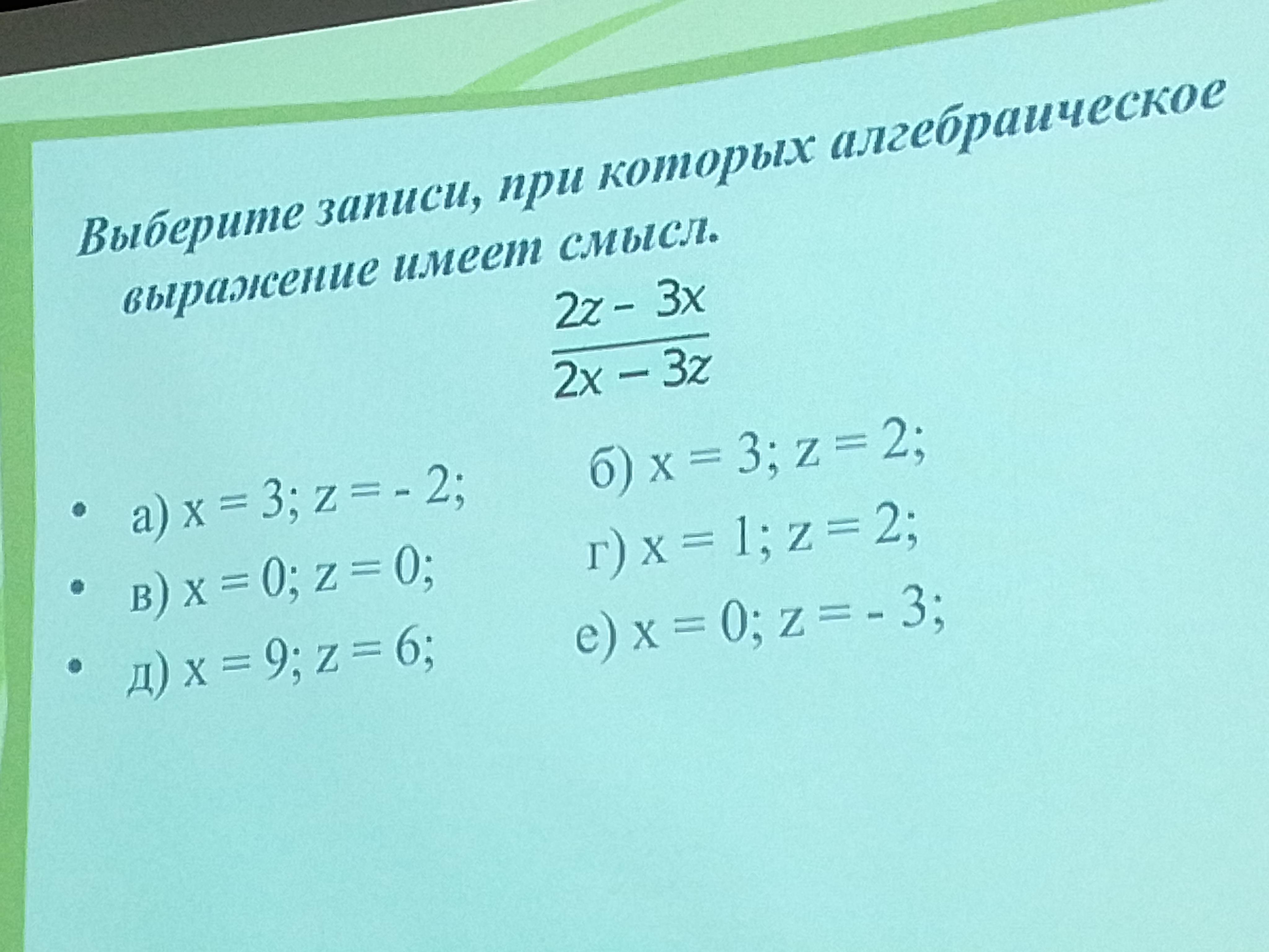 в) (2*0-3*0) / (2*0-3*0) = 0/0 не имеет смысл