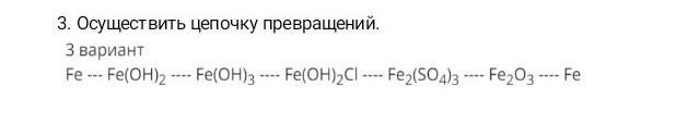 3. Осуществить цепочку превращений. 3 вариант Fe --- Fe(OH)2 Fe(OH)3 - Fe(OH)2Cl -... Fe2(SO4)3 ---- Fe2O3 Fe