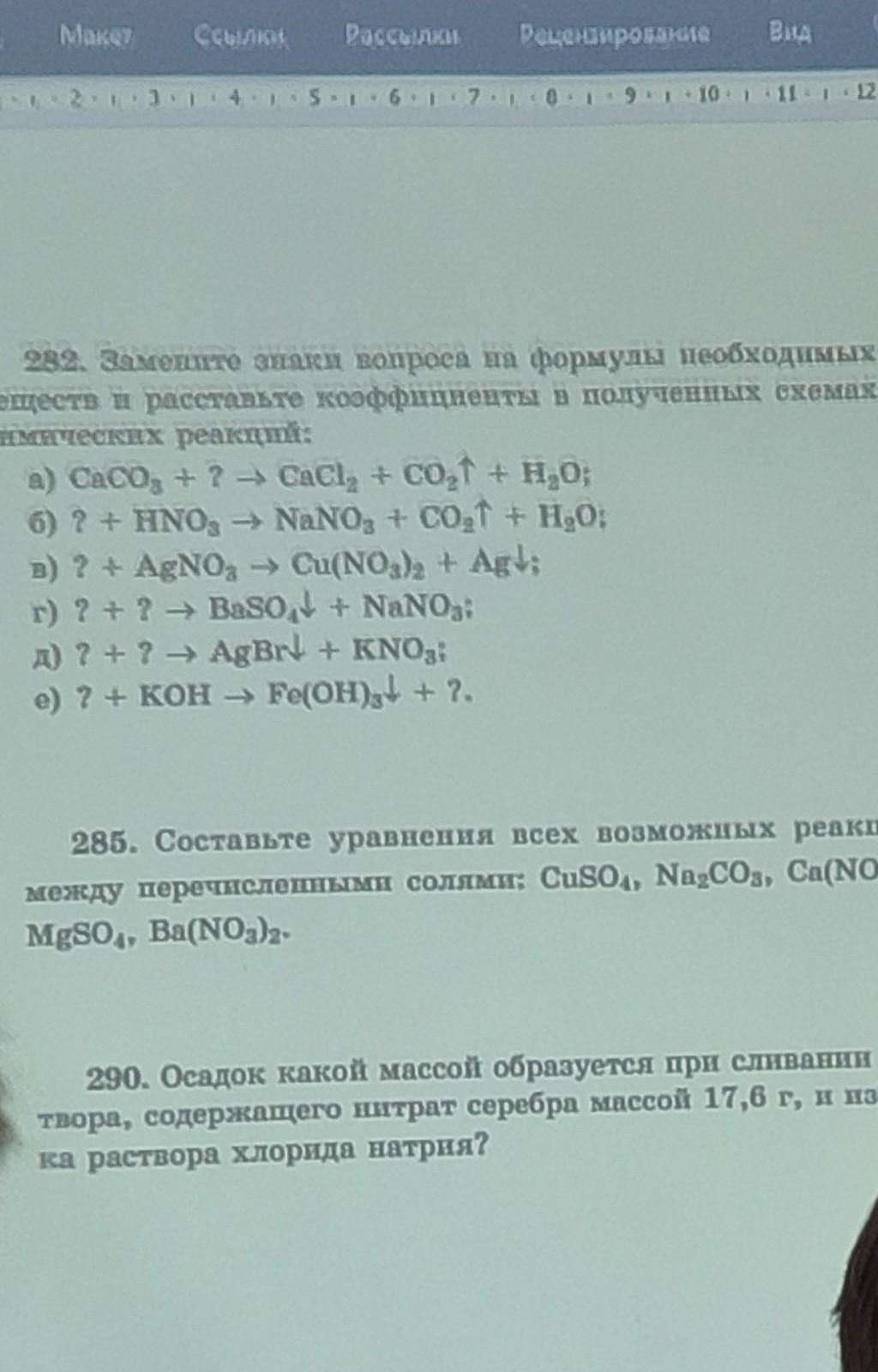смотрите фото. 982. Замените знаки вопроса на формулы необхо веществ и расставьте коэффициенты в полученных химических реакций: a) CaCO3 + ? → CaCl2 + CO2↑ + H2O; 6) ? + HNO3 → NaNO3 + CO2 + H2O; в) ? + AgNO3 → Cu(NO3)2 + Agl; г) ? + ? → BaSO4 + NaNO3 д) ? + ? → AgBrl + KNO e) ? + КОН → Fe(OH)2+ + ?.